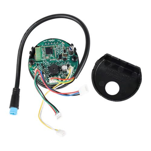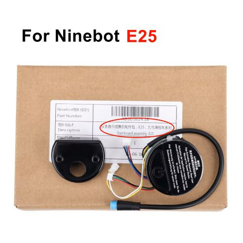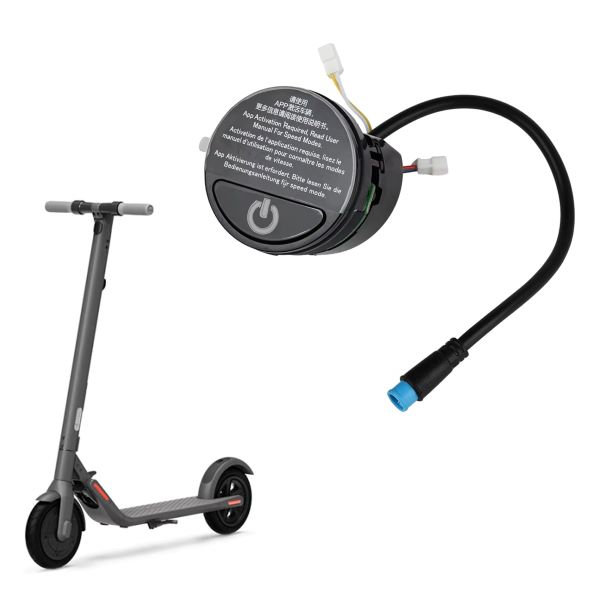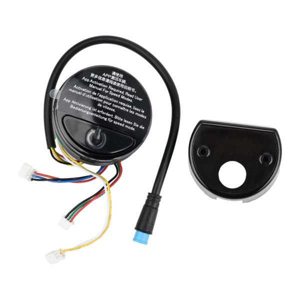 Dashboard / display unit with wiring for Ninebot E-series electric scooters. Has Bluetooth connection to Ninebot app. Displays scooter speed, battery level, light controls, drive mode etc.